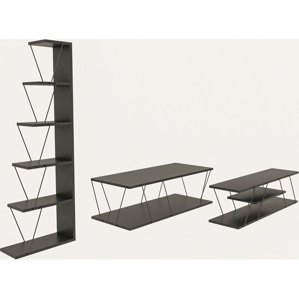 Möbelpaket med soffbord, mediabänk och bokhylla. Tillverkade av melaminbelagd spånskiva och metall.