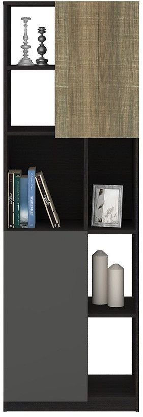 Hylla med modern design och mycket praktisk förvaring. Hyllan har två mindre skåp och flera öppna fack vilket ger dig möjligheten att både dölja och visa upp t.ex prydnadssaker. Hyllans ram är svartmålad och skåpsdörrarna är målat i grått och en i naturlig ek.