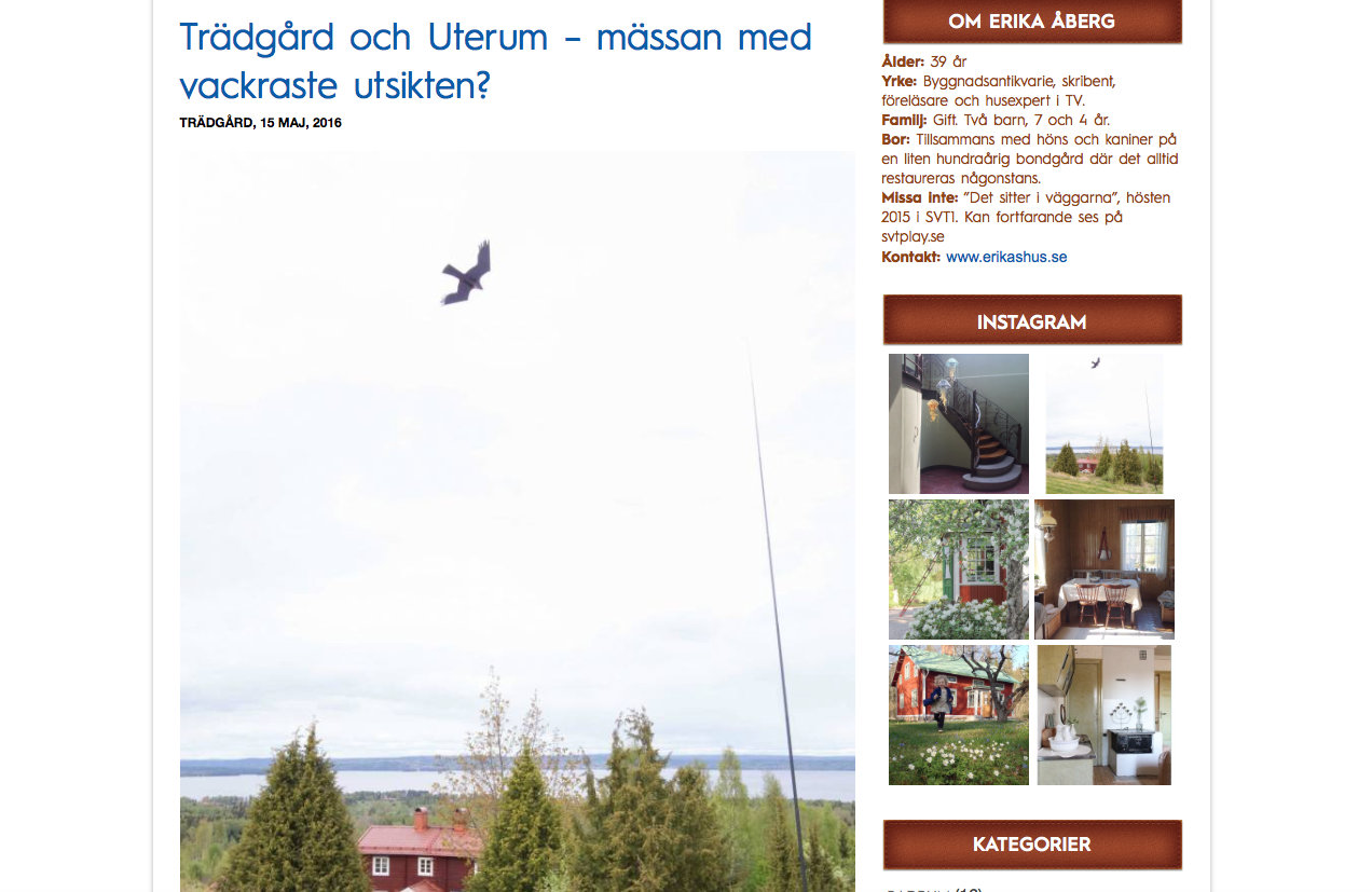 Den hundraåriga gården inte långt från Dalälven Erika bor på med familjen på passar verkligen denna bloggares livstil. Erika i ERIKAS HUS är en trädgårdstokig byggnadsvårdsnörd och hennes fritid fylls med just restaurering och trädgård. Vi har också kunnat följa denna renovering på den tidigare bloggen Fru Åberg i Lågbo. Men det är inte bara på fritiden som Erika lever med gamla hus för hon är till yrket byggnadsantikvarie, skribent och föreläsare och många av oss känner även igen henne som husexpert i TV. Erika säger att hennes intresse kommer från lika delar frustration som passion, det förstnämnda över hårdhänta renoveringar och det andra för kärleken till de byggnadslösningar och material man förr använde. Erika lever och andas kärlek till gamla hus och arbetar på ett härligt inspirerande sätt för att skapa kunskap om dem. Vi tycker om Erikas idé om att tillvara hela husets historia och låta delar av det som skett under tidens gång leva kvar och inte tas bort vid nutida restaureringar och vi gillar också höns.....