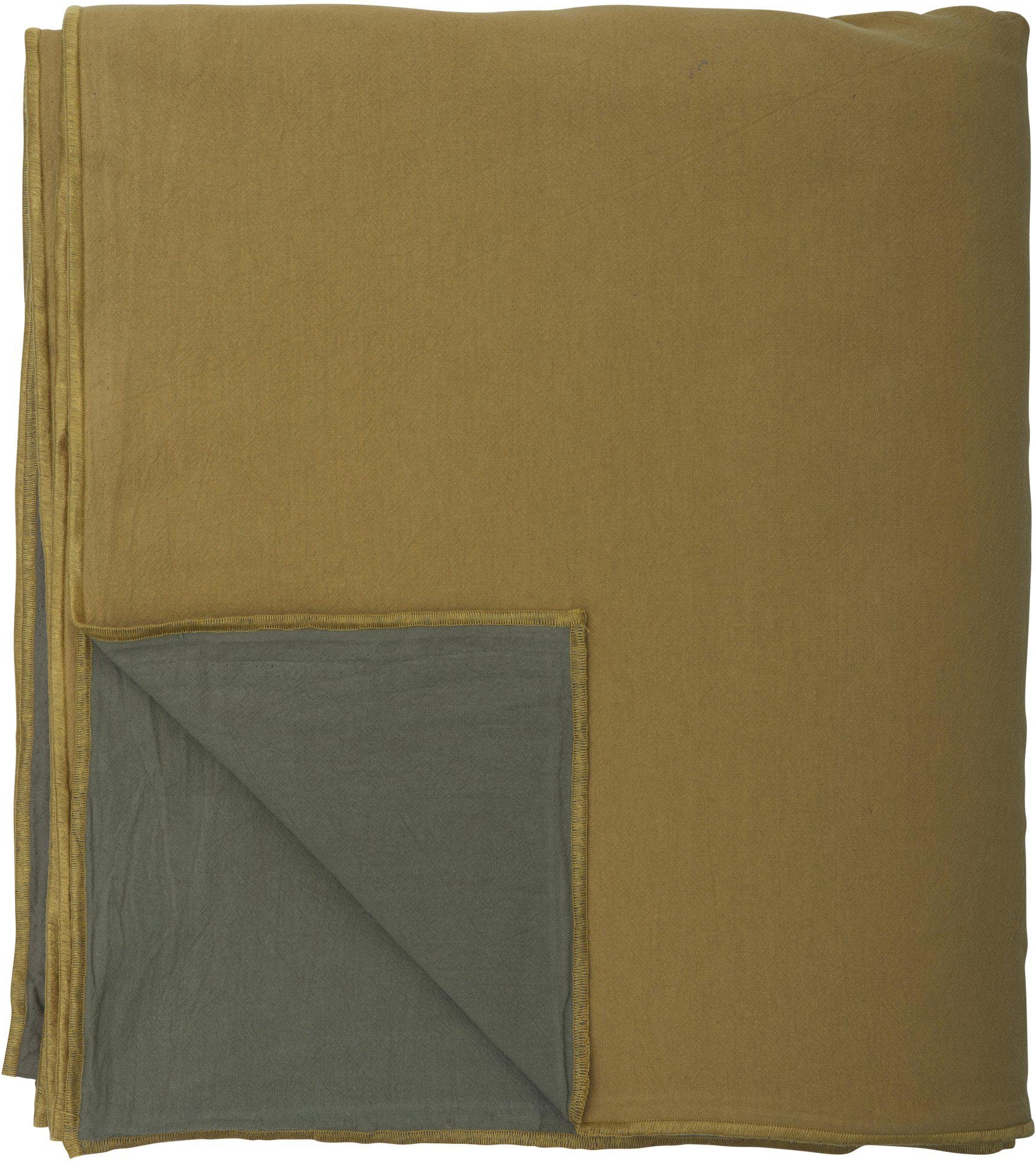Bomullsduk i ockragult och grönt med fin söm runtom. Praktisk dubbelsidig duk som är lika fin på båda sidorna.