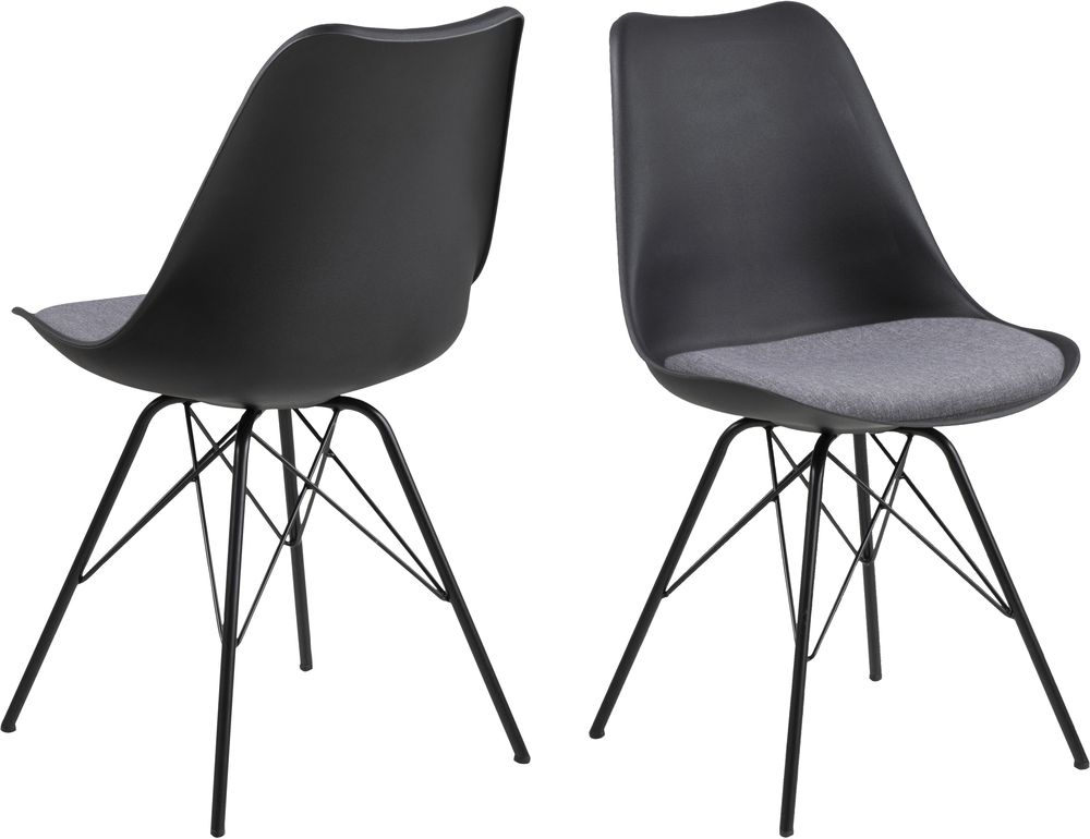 Matstol med underrede tillverkat av svart pulverlackerad metall, sitsen är av svart plast och sitsdynan är klädd i ljusgrått tyg för maximal komfort.