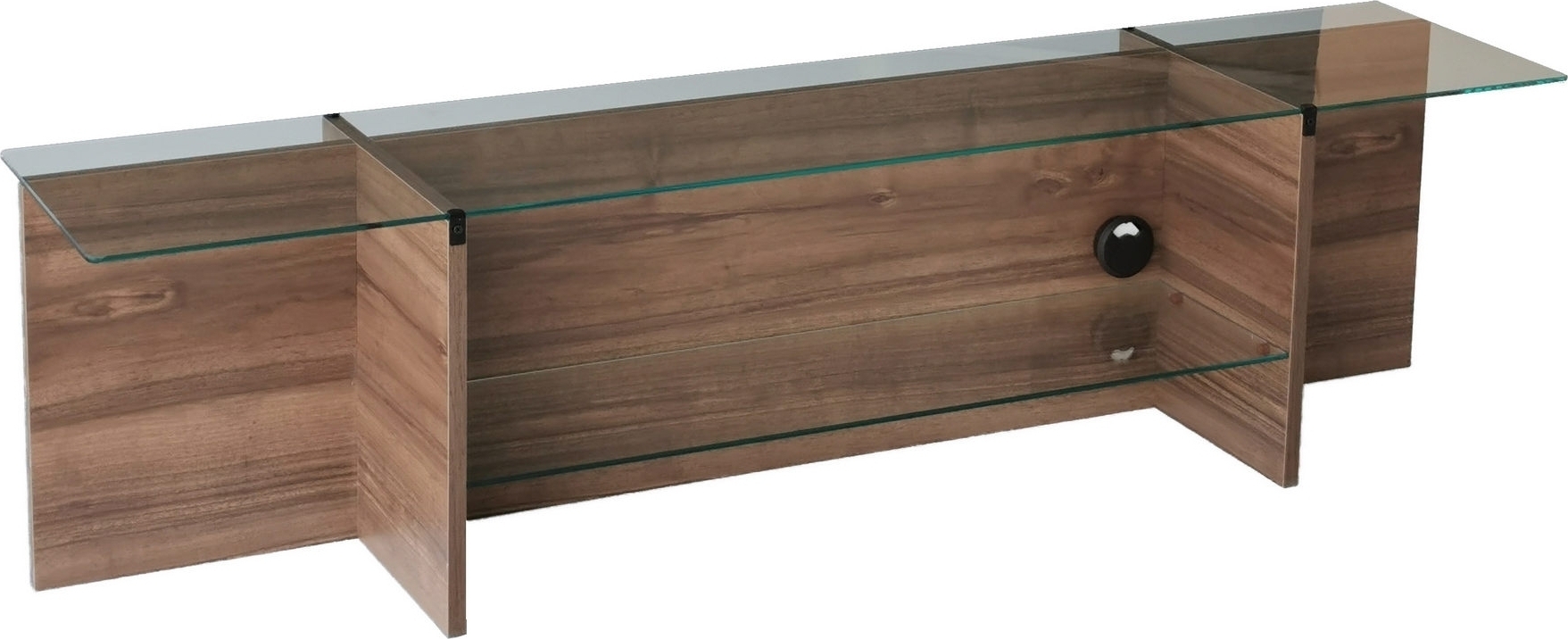 Mediabänk av tempererat glas och melaminbelagd spånskiva.
