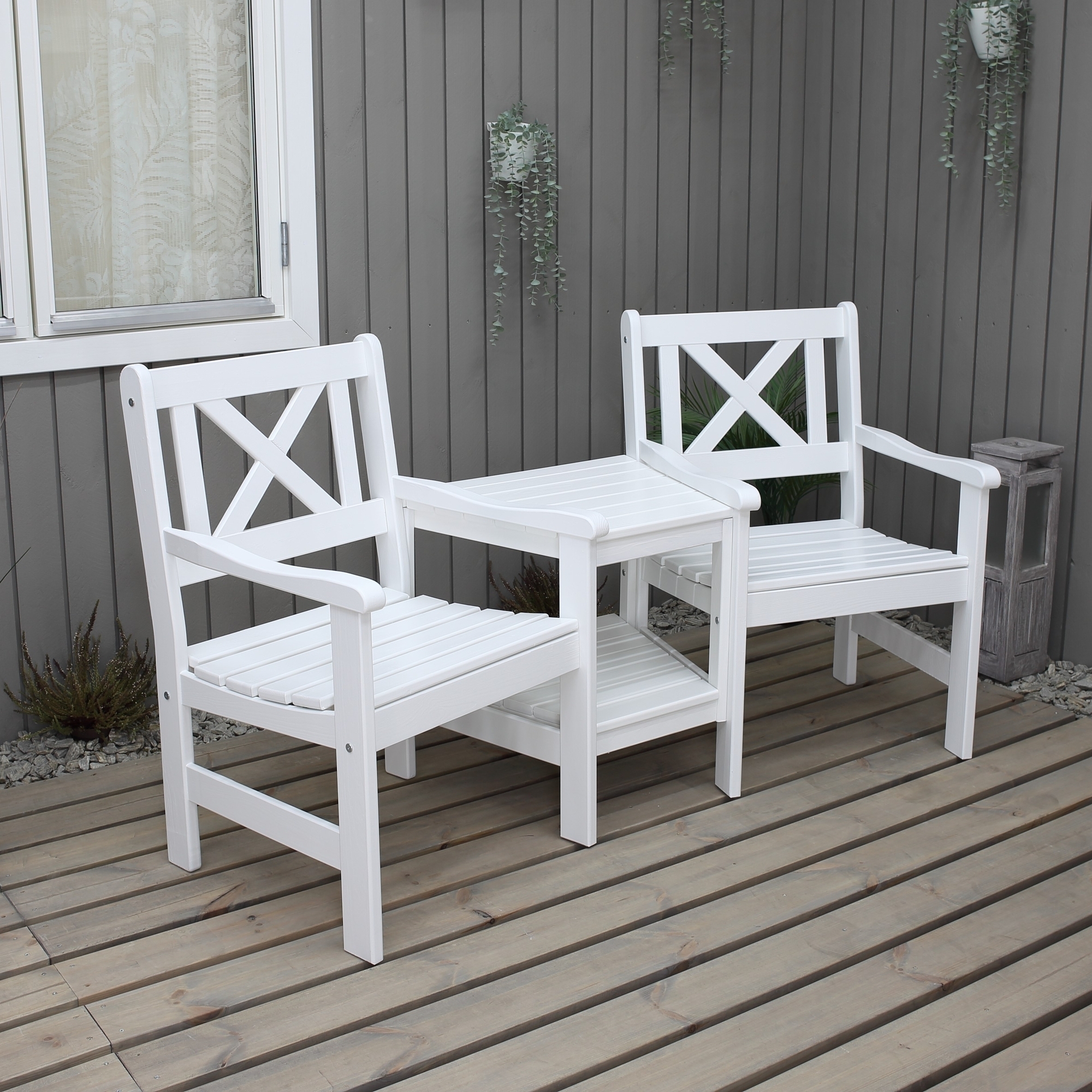 Trädgårdsbänk med två sittplatser och ett bord emellan i vitlaserad furu med klassisk uttrycksfull design. Fungerar utmärkt som grupp eller som ett rent smycke i trädgården.