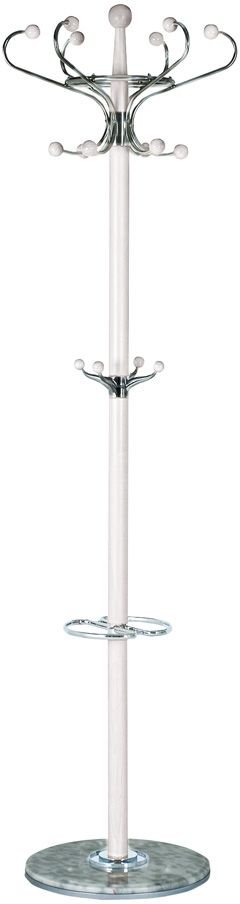 En snygg tamburmajor med en klassisk design. Klädhängaren är tillverkad av kromad metall med detaljer i vit trä, med ett flertal krokar i olika höjdlägen.