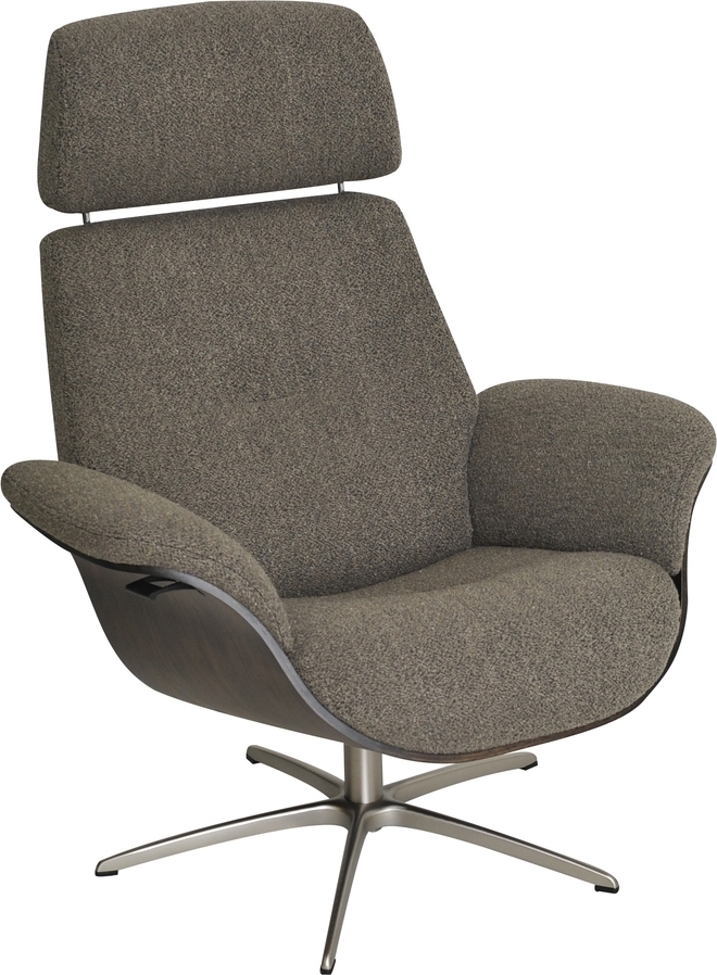 Snurrbar fåtölj med reclinerfunktion. Fåtöljen snurrar 360 grader och återgår till utgångsläget när man reser sig upp. Reclinern styrs med hjälp av en spak på sidan av stolen och en gasfjäder garanterar en jämn recline. Den femstjärniga metallbasen gör så att stolen hela tiden står stabilt. Levereras omonterad.