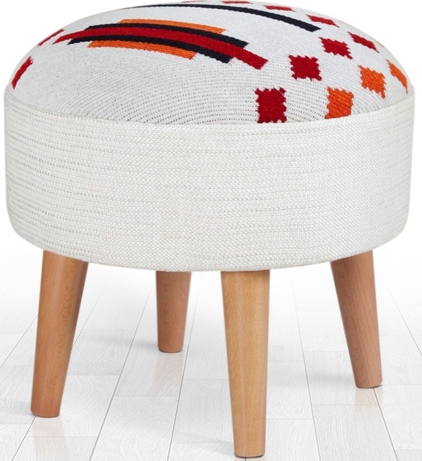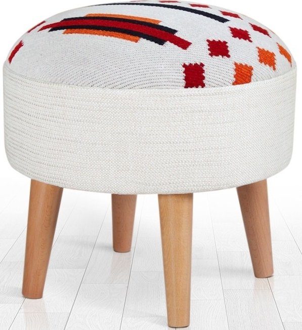 Sittpuff av trä. Klädd med bomull och polyester. Stoppning av skum.