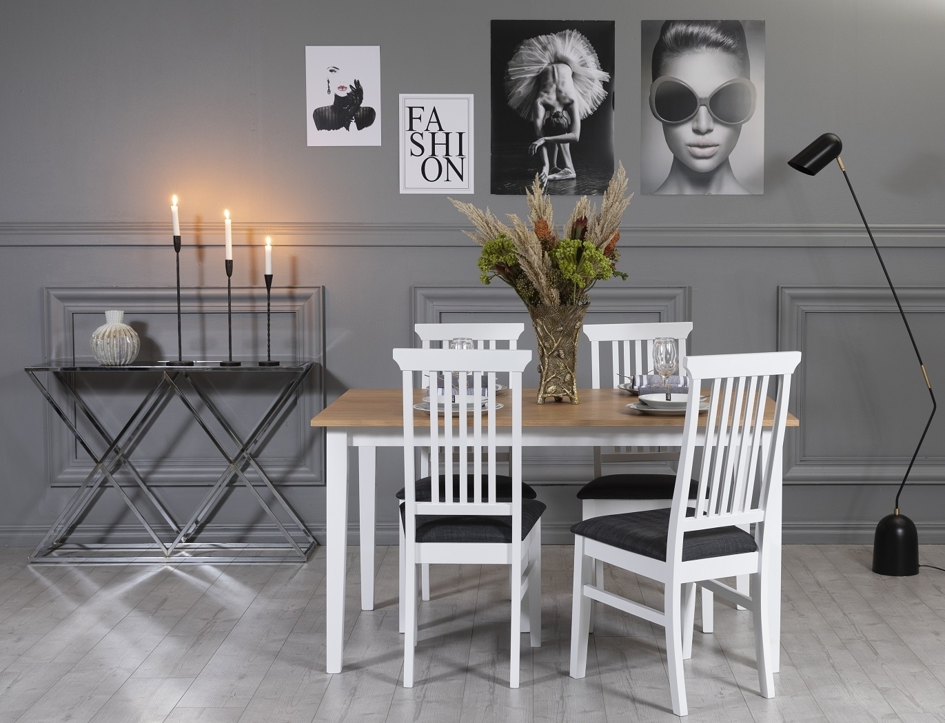 Klassiskt matgrupp, bord med underrede av massivt vitlackat trä, bordsskiva av MDF med stryktålig oljad ekfanér. Denna matgrupp finns även med 180 cm bord. Modern stol i massivt heveaträ, vitlackad med stoppad mjuk sits av grått tyg.