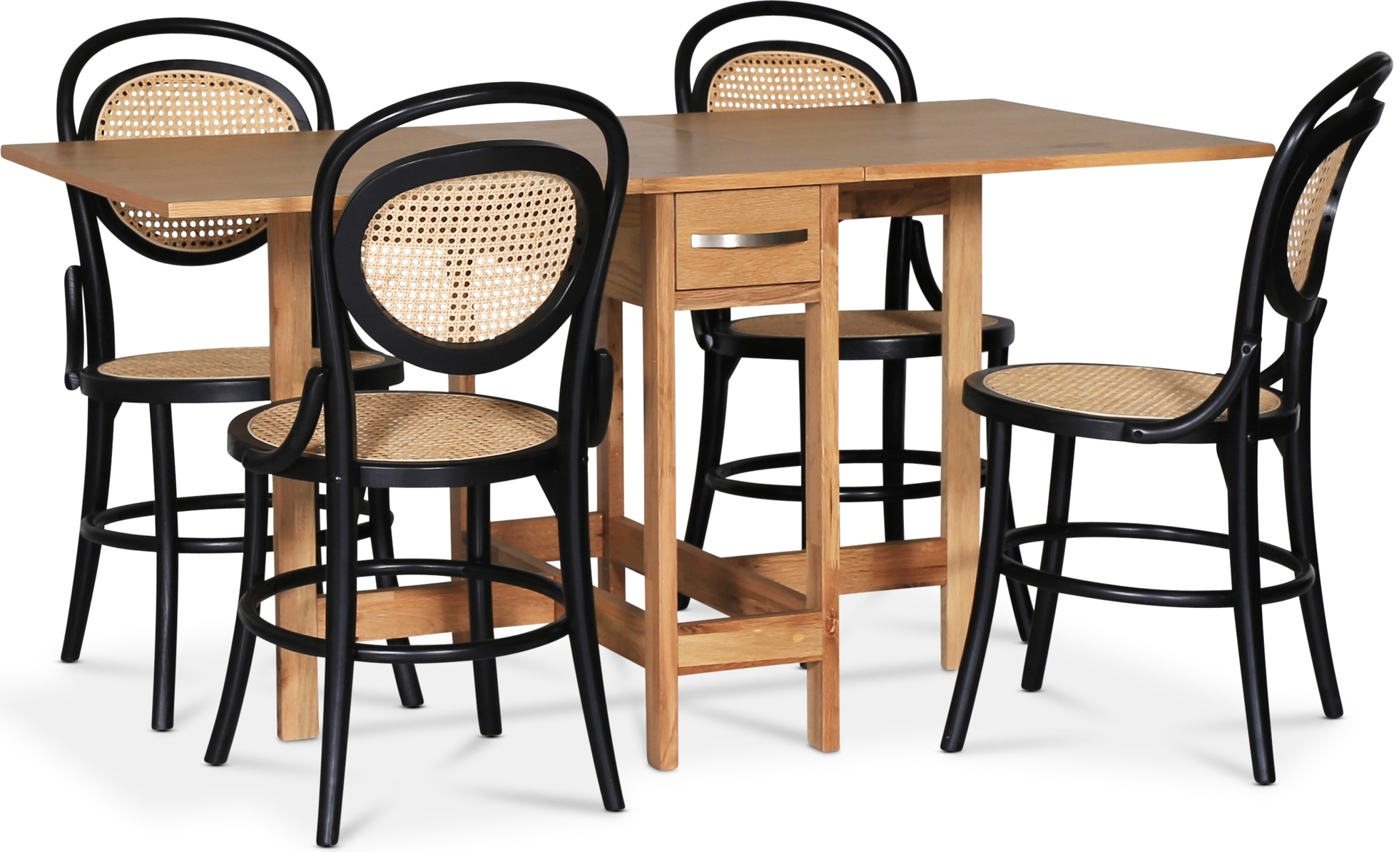 Fårö matgrupp i klassiskt utförande. Fårö klaffbord med 4 st matchande svarta Alicia stolar med rotting i både sits och rygg.