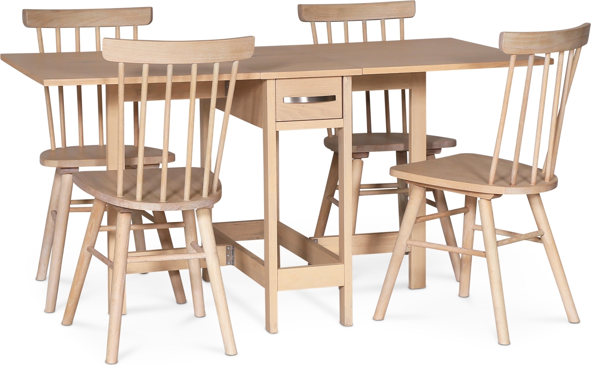 Fårö matgrupp i klassiskt utförande. Fårö klaffbord med 4 st matchande Orust pinnstolar i whitewash.