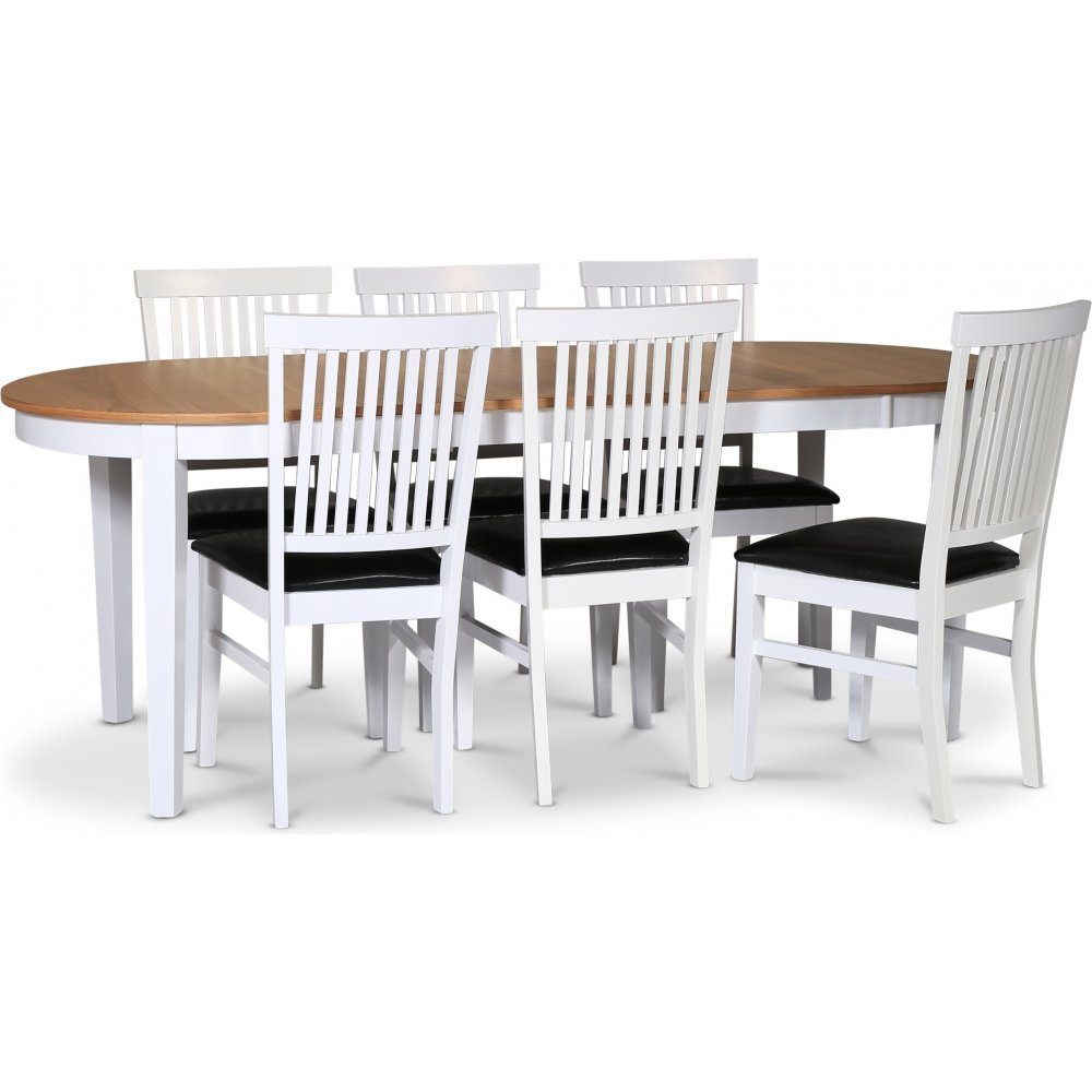 Skagen matgrupp från Skånska Möbelhuset, klassiskt matbord 160/210x90 cm med vitt underrede och en toppskiva i brunoljad ekfanèr. Det ingår 6 stycken matchande Fårö matstolar i vitlackat trä med sits i svart PU.
