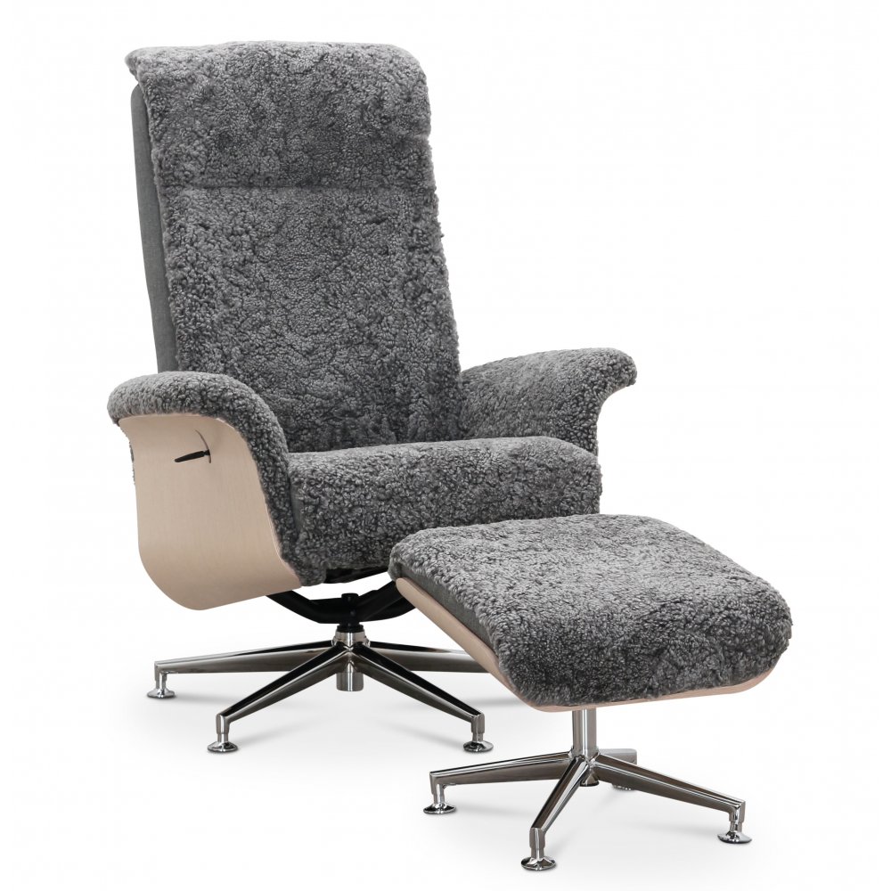 Fåtöljen är utrustad med en reclinerfunktion som kan justeras och låsas i olika lägen. Detta gör att du enkelt kan hitta en optimal position för vila och avkoppling. Den medföljande fotpallen i matchande fårskinn höjer komforten ytterligare och skapar tillsammans med fåtöljen en komplett lösning för ditt favoritrum.