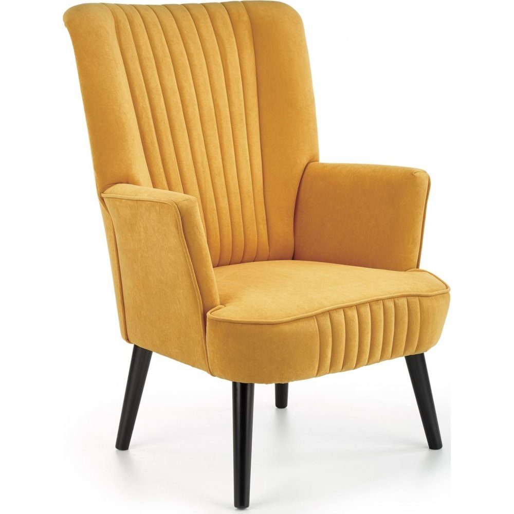 Denna stilfulla fåtölj kombinerar retroinspirerad design med modern komfort, vilket gör den till ett perfekt komplement till vardagsrum, sovrum eller läshörnan. Klädd i en vacker gul klädsel i sammet och med dekorativa vertikala sömmar på ryggstödet och sitsen, tillför den en lyxig och färgglad touch till ditt hem.