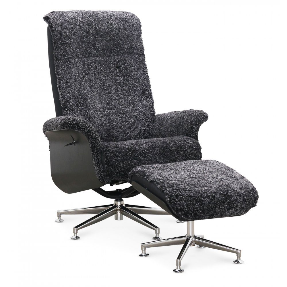 Reclinerfåtölj klädd i äkta mörkgrått fårskinn och har vackert svartbetsad ek på armstöden vilket gör den till en fåtölj med klassisk känsla. Det kromade metallstativet ger en modern kontrast och förstärker den klassiska designen.
