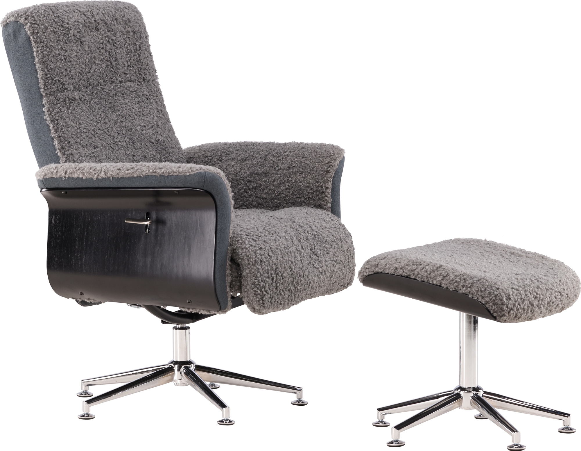 Här i grått teddy med trä på sidorna svartbetsat ekutförande samt snurrbart stativ i kromad metall för att återge ett exklusivt utseende och känsla. Recliner funktionen går att ställa och låsa i olika ställningar. Matchande fotpall ingår.