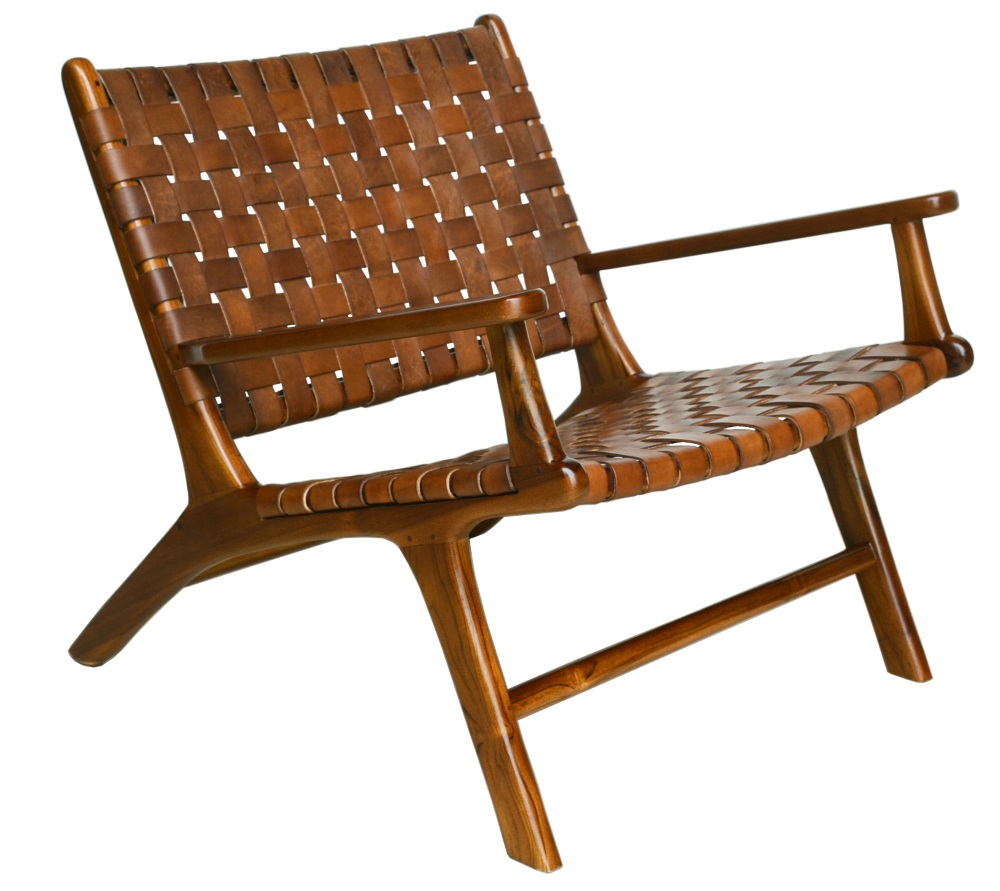 Porto fåtölj i massivt teak med sits och rygg i sadelgjord av brunt läder. Fåtöljen tillhör vår populära serie Porto.