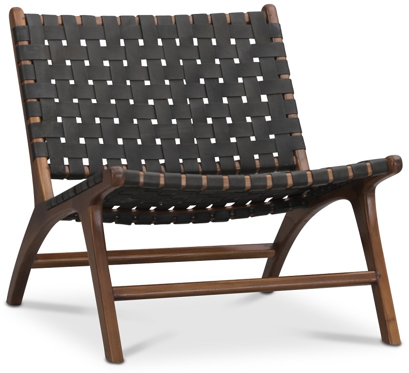 Porto fåtölj i massivt teak med sits och rygg i sadelgjord av svart läder. Fåtöljen tillhör vår populära serie Porto.
