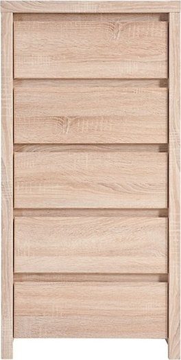 En stilren byrå i ljus ek-imitation med fem lättutdragna lådor som passar i det moderna hemmet. Med dess kompakta med ändå rymliga storlek passar den in i sovrummet såväl som hallen.