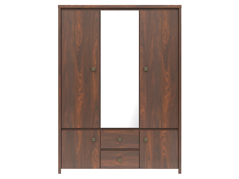 En rymlig garderob i mörk ek med tre dörrar varav den mittersta dörren är en spegel. Undertill finns två mindre skåp och två lådor där du kan förvara mindre saker.