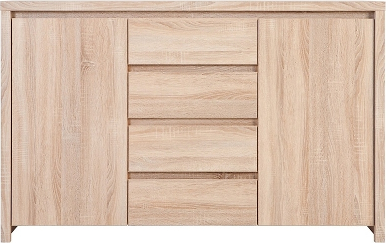 Ett fint sideboard tillverkat i MDF med ljus ek utförande. Sideboardet har två skåp och fyra lådor med integrerade handtag, vilket gör förvaringsmöjligheterna stora. Passar perfekt in i flera olika miljöer.