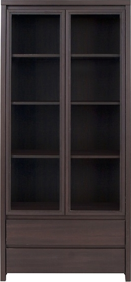 Ett fint vitrinskåp i mörk ek med två glasdörrar. Skåpet har två lådor undertill med integrerade handtag för förvaring av mindre föremål.