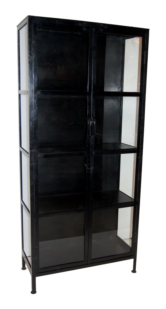 Robust skåp i svart metall, två dörrar i glas samt 3 hyllplan. Detta industriliknande skåp ger en vintagkänsla till din inredning samtidigt som det erbjuder praktisk förvaring.