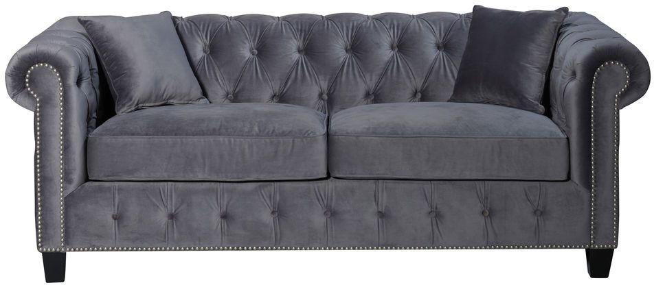 Ståtlig chesterfieldsoffa i grå velour med kromade spikar framtill. Ben i mörkbrunt massivt heveaträ. 2 st kuddar ingår.