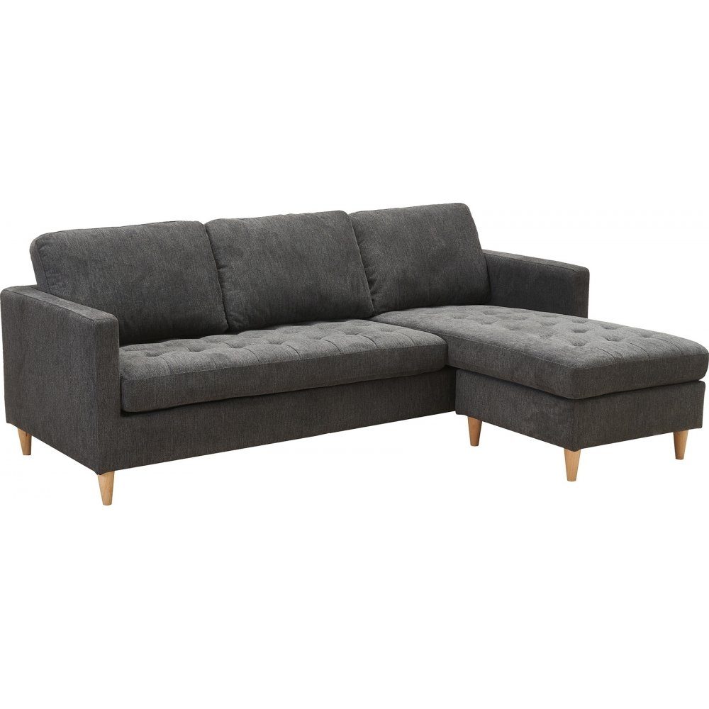 Divansoffa i mörkgrått tyg med träben. Divandelen är vändbar och kan placeras både till höger eller till vänster.