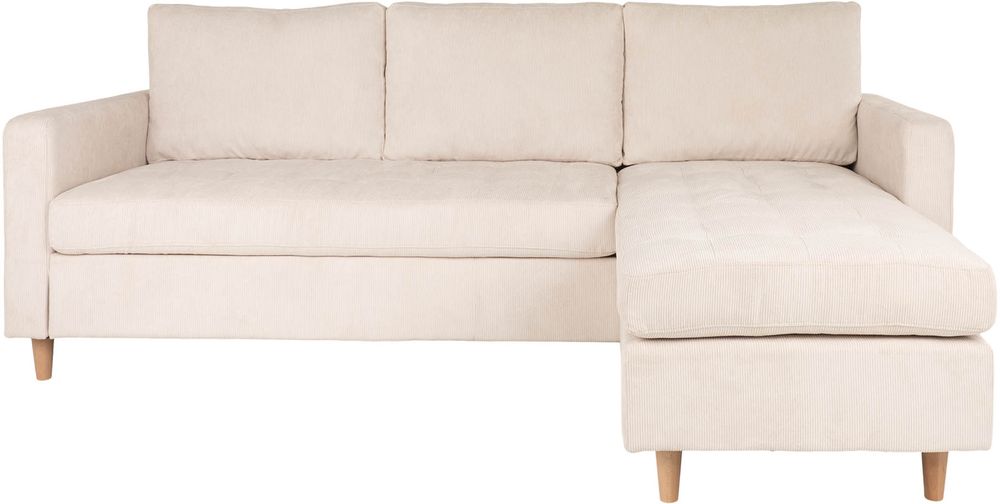 Divansoffa i sand sammet med träben. Soffan kan monteras med divanen antingen till vänster eller höger.