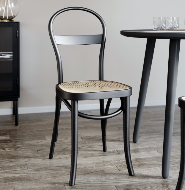 Fitchburg matgrupp från Skånska Möbelhuset, förlägningsbart matbord 106-141 cm med vitt underrede och en toppskiva i oljad ekfanèr. Det ingår fyra stycken matchande Danderyd matstolar i svartlackat trä med rottingsits.