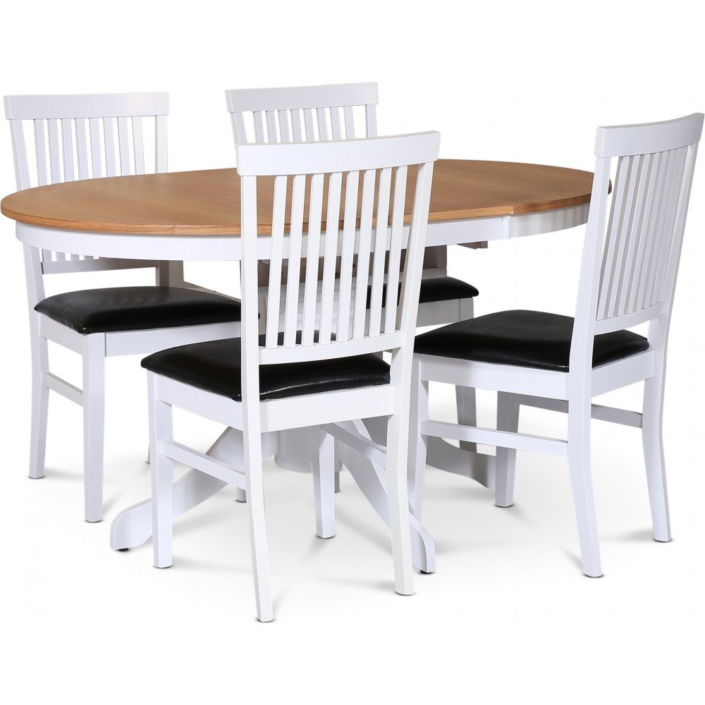 Fitchburg matgrupp från Skånska Möbelhuset, klassiskt runt matbord 106 cm i diameter, kan förlängas till ovalt bord 141 cm, med vitt underrede och en toppskiva i oljad ekfanèr. Det ingår 4 stycken matchande Fårö matstolar i vitlackat trä med sits i svart PU.
