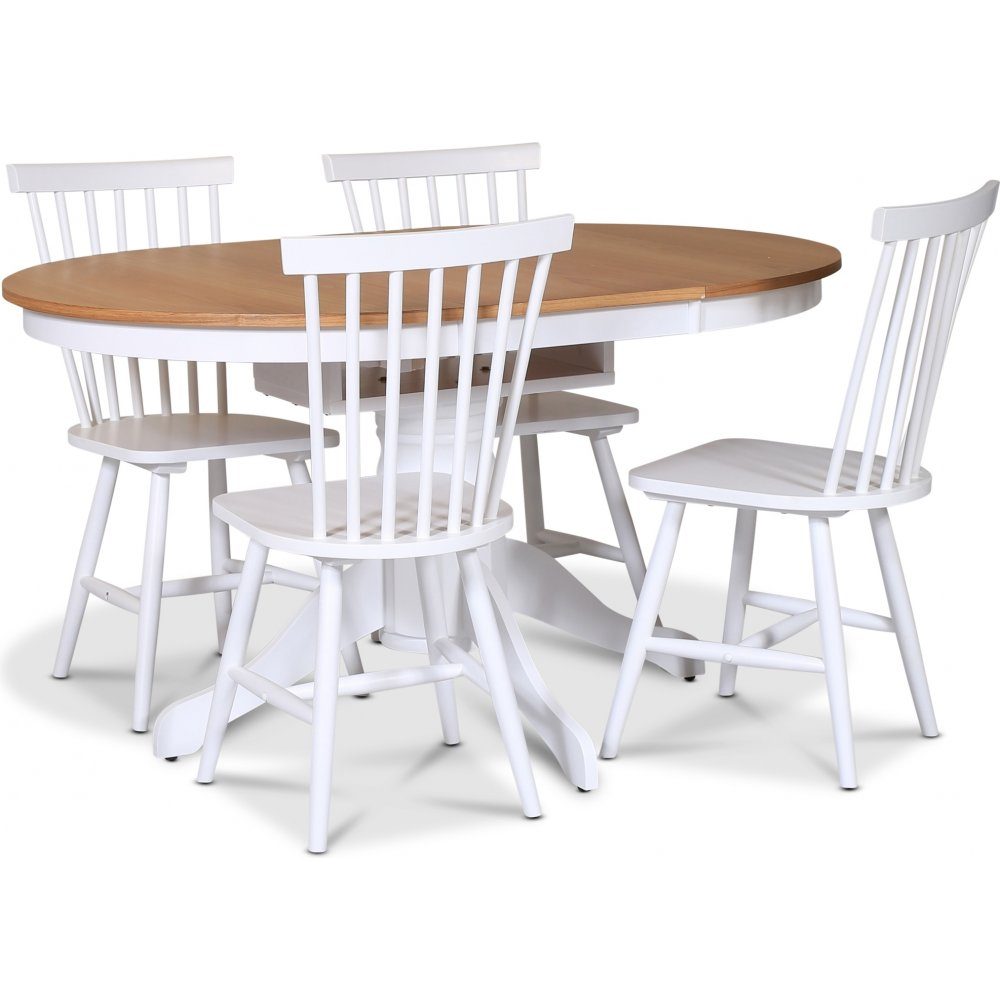 Fitchburg matgrupp från Skånska Möbelhuset, klassiskt runt matbord 106 cm i diameter, kan förlängas till ovalt bord 141 cm, med vitt underrede och en toppskiva i oljad ekfanèr. Det ingår 4 stycken Karl pinnstolar i vitlackat trä.