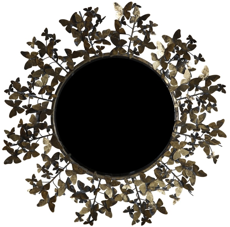 Rund spegel med fjä'rilar i ett antikt utförande.