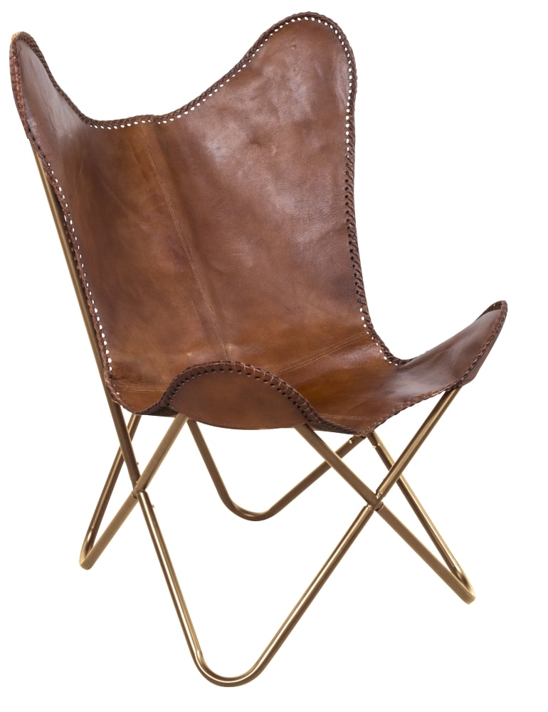 Klassisk stol i fladdermusinspirerad design. Utförande i brunt äkta läder som samspelar fint mot stolens mässingsfärgade metallunderrede.
