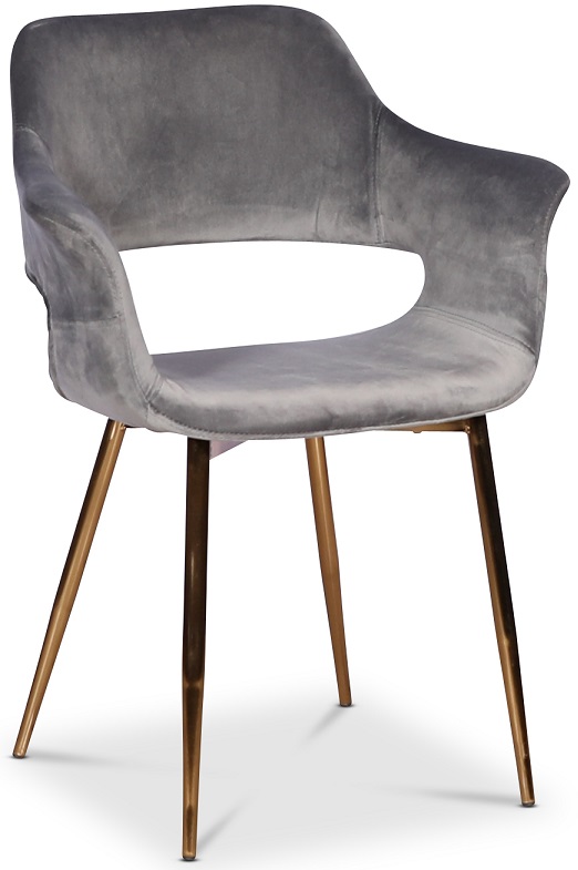 Flap är en stilig karmstol klädd i grått sammetstyg med ben i mässing.