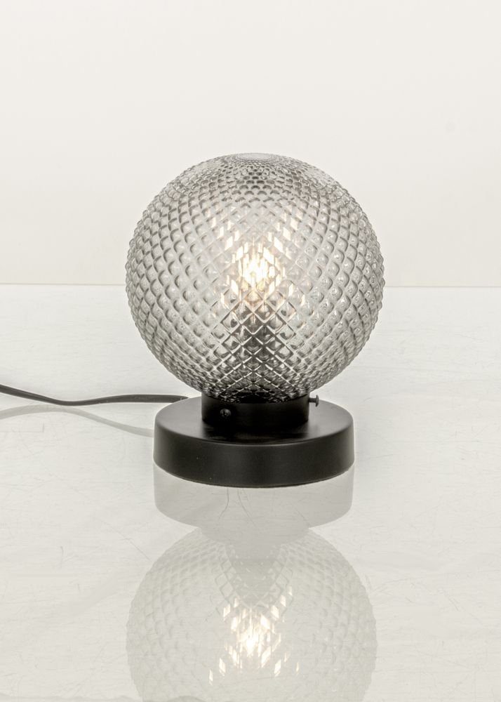 Bordslampa i metall med svart utförande och glaskupa i rökgrått.