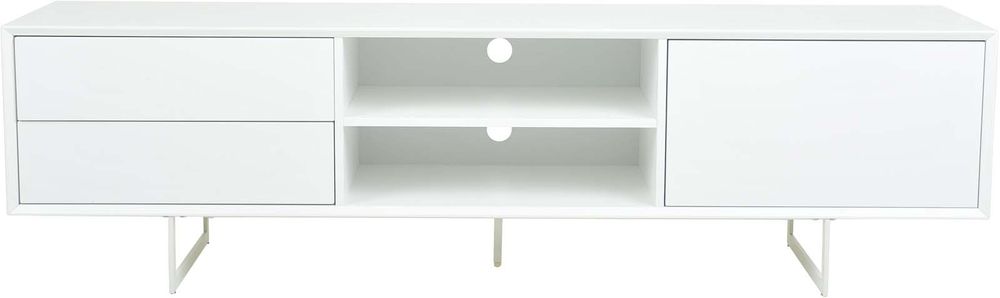 Modern mediabänk i mattvit med smalt underrede. Plats under för att komma åt att städa. Mediabänken har 1 dörr, 2 lådor samt 1 fack för mediaenheter eller dylikt.