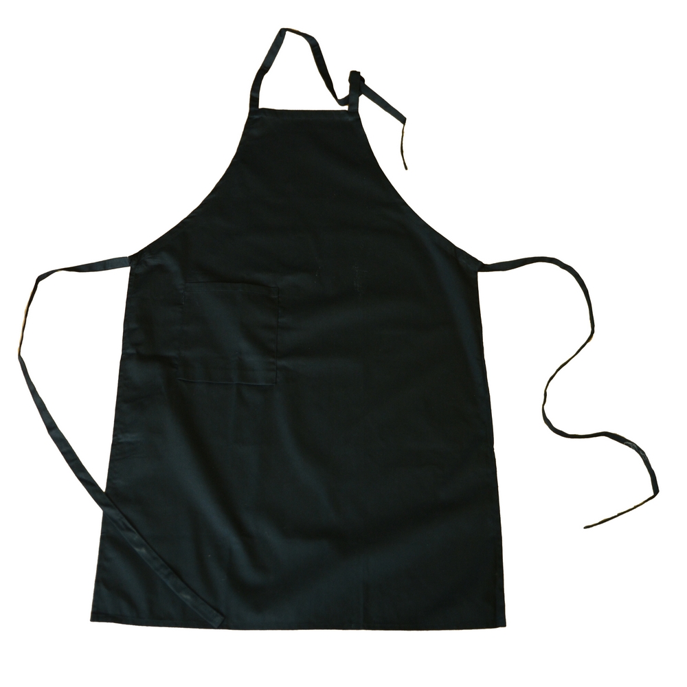 Ett klassiskt bröstlappsförkläde med reglerbart nackband och ficka på höger sida.