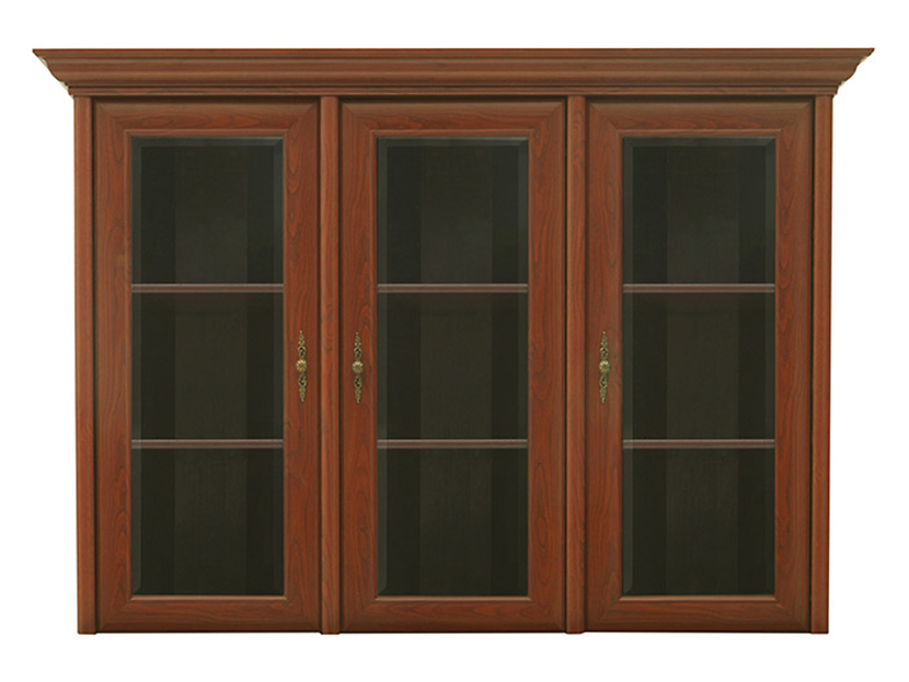 Ett överskåp i kastanj med tre dörrar i glas med dekorativa handtag. Överskåpet ska sättas uppe på en byrå i samma möbelserie och blir då en förlängning av byrån och blir tillsammans en mycket rymlig möbel.
