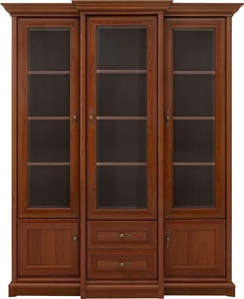 Ett stort vackert vitrinskåp i kastanj med dekorativa handtag. Skåpet har två lådor i mitten och två mindre skåp på vardera sida vilket gör det möjligt att även förvara mindre föremål. I de övre skåpen finns det många hyllplan som på ett enkelt sätt organiserar dina saker.