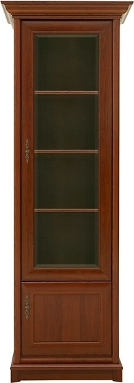 Ett smalt vitrinskåp i kastanj med dekorativa handtag. Skåpet har många funktionella hyllplan och ett mindre skåp nedanför där man kan förvara de saker man vill ha dolt.