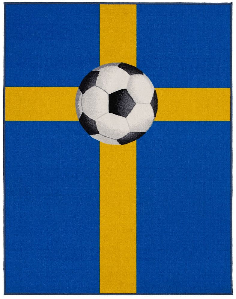 Fotbollsmatta Sverige är en lekfull matta med Sverige flagga samt en fotboll i mitten.