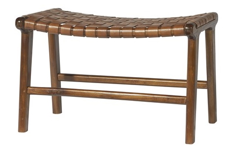 Porto fotpall i massiv teak med sits i sadelgjord av konjaksfärgat läder. Fotpallen tillhör vår populära serie Porto.
