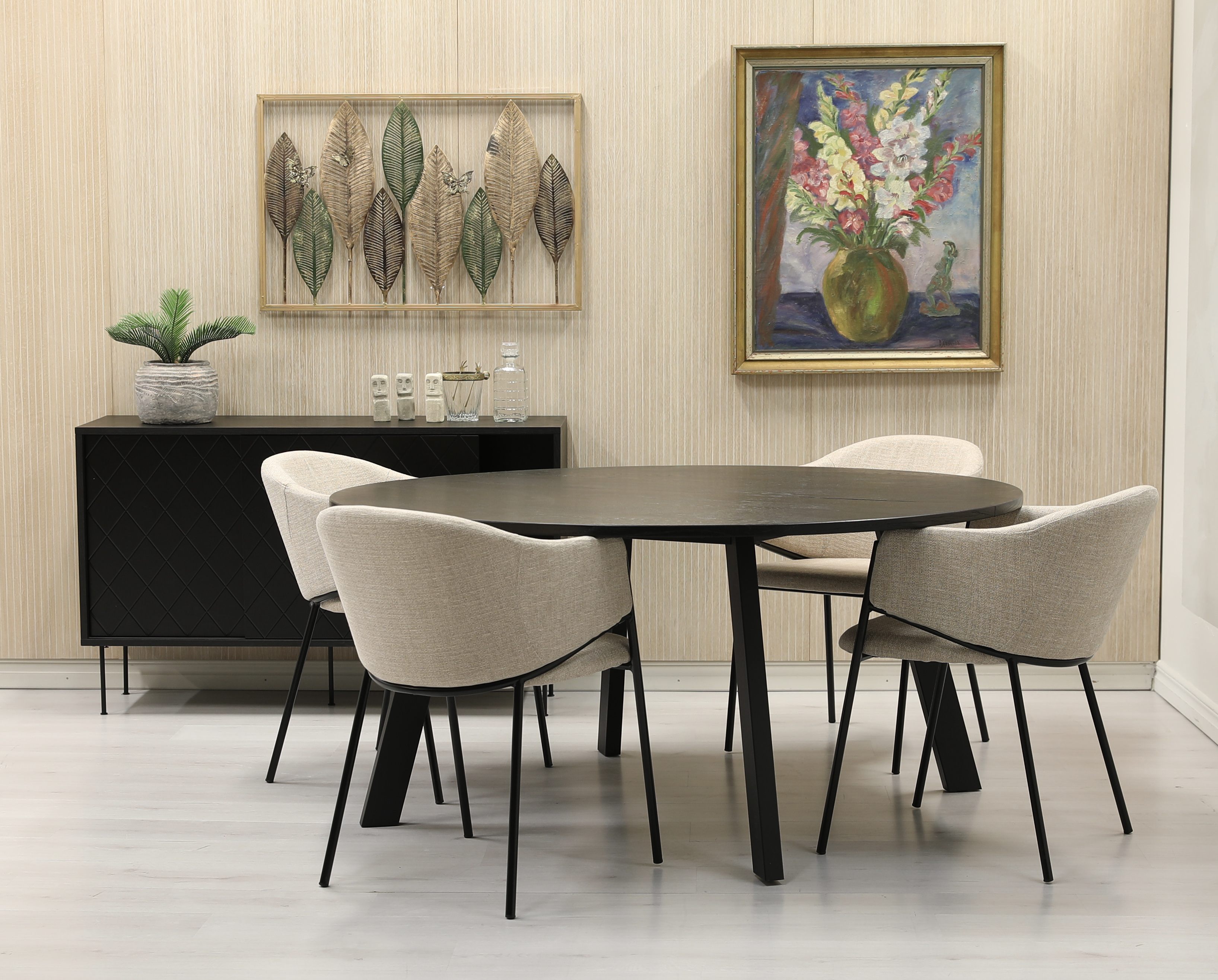 Freddy matgrupp i svartbetsad ek, runt stort matbord med en diameter på 155 cm med 4 st Stacey stolar i beige tyg.