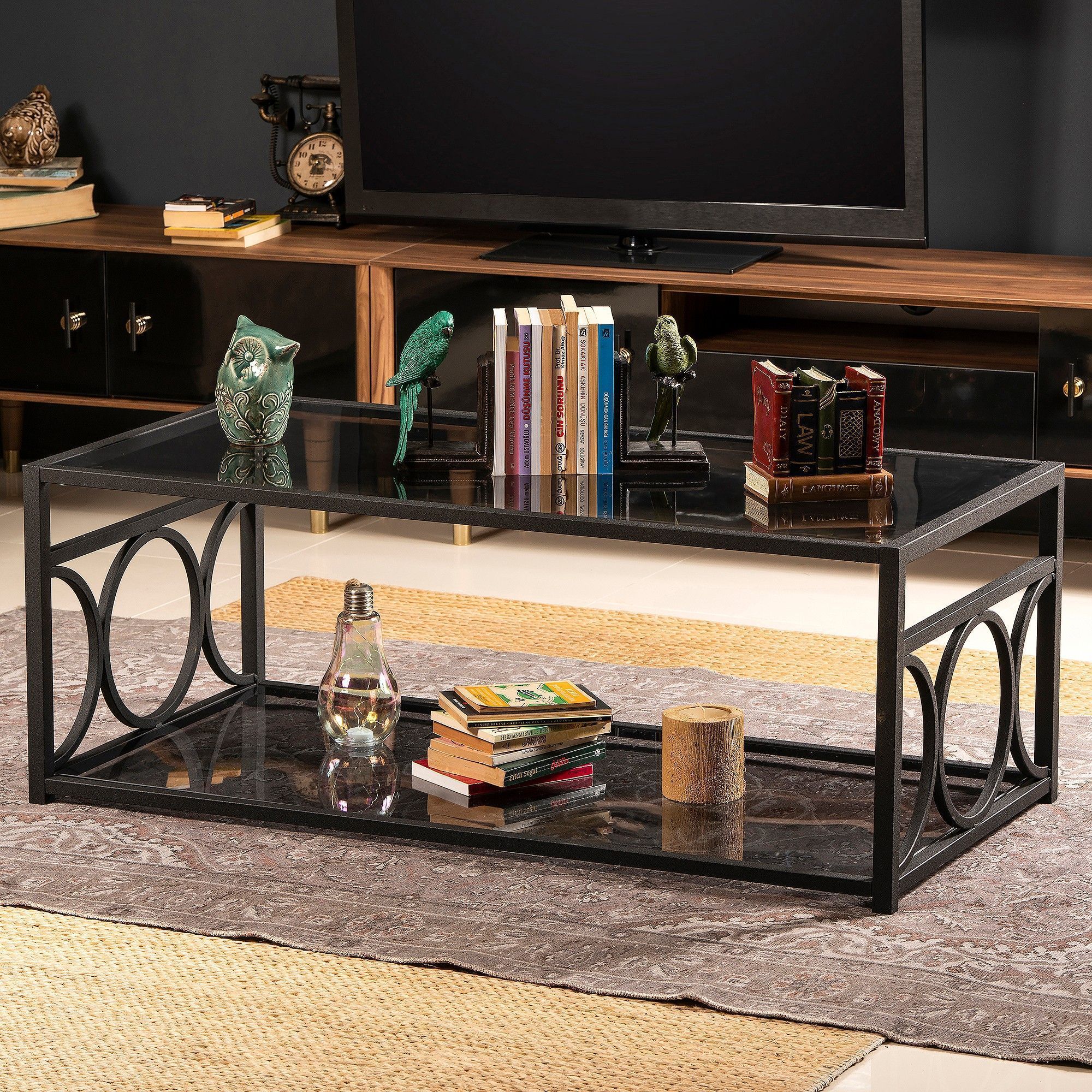 Soffbord av trä, metall och tempererat glas.