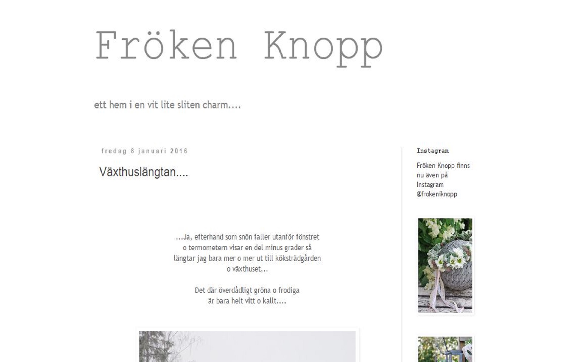 Fröken Knopps blogg befinner sig en lantlig miljö som landat i ett vitt, vitt, vitt hus & hem där en lite sliten charm är tillåten och sätter stilen. Annat som sätter stilen är en överbyggd vit, vit, varenda med träräcke och korgstol och kanske för att Elin är florist (då får man döpa bloggen till Fröken Knopp) så får de vackra pelargonerna vara med. Charmigt och väl genomfört och jojomen även gummistövlarna på verandan och lilla tjejens fina kofta och den charmiga "pinnakärran" är vit. Nämnde vi vad det är för färg på katten....? Man skulle ju kunna tänka sig..... Den heter Svea.....