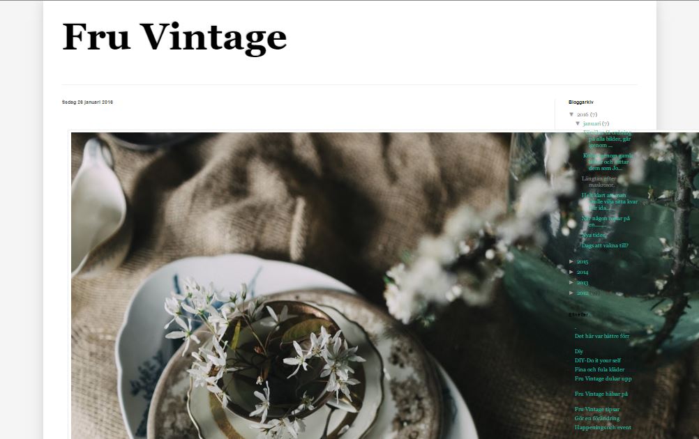 Fru Vintage låter oss förstå redan med namnet på sin blogg vad det är man kan vänta sig. Fru Vintage älskar återbruk, återvinning och gamla ting och bloggar om allt från dukningstips till just återvinning och alla de ting som är hittade på Läkarmissionens secondhandbutik men också på t ex vägmarknader. Dukas det så blir det med udda glas och vintageporslin med gamla veckotidningar som underlägg och lika gamla handdukar med monogram vid bröllopsdukning och allt blir magiskt med vackra bilder som tagits i ladan. Du hittar också bilder och idéer från t ex inredare, bloggare och pinterest på fina inredningar som Fru Vintage tycker om och som ger inspiration till hur vintagefynd kan användas i inredningar. Under en etikett kan Fru Vintages hem ses.