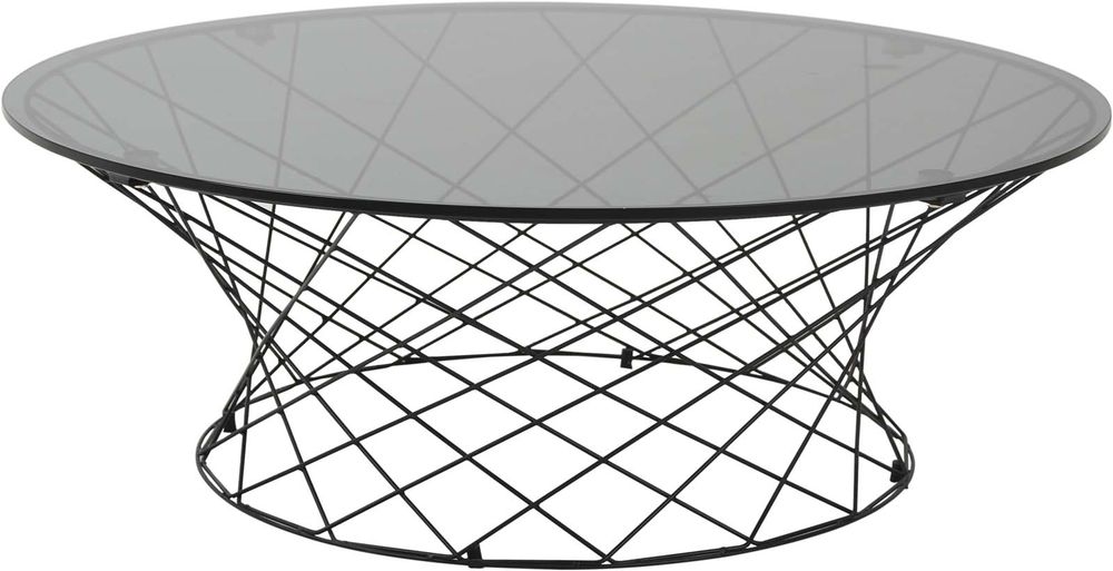 Modernt soffbord med bordsskiva i mörkgrått glas och underrede i svart pulverlackerat stål.