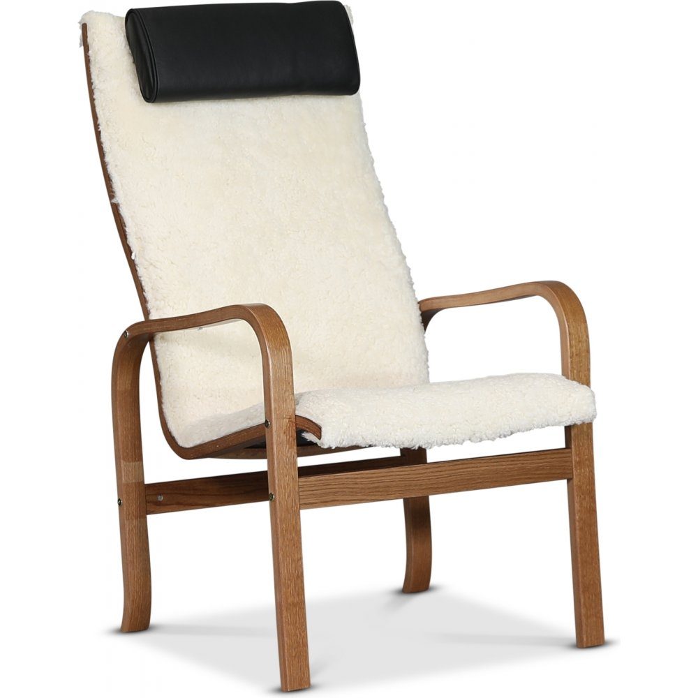 Fushion fåtölj är designad i Danmark av Nielsen design med känsla för det skandinaviska hemmet. Möbeln är klädd i ljustäkta fårskinn med välarbetade armstöd i brunbetsad ek-fanèr. En designklassiker som håller för framtiden. Fåtöljen kan både användas med och utan nackkudden i äkta svart läder.