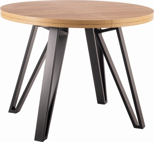 Matbord av trä med underrede av metall. Runt matbord Ø100 cm i diameter som går att förlängna med den medföljande iläggsskivan.