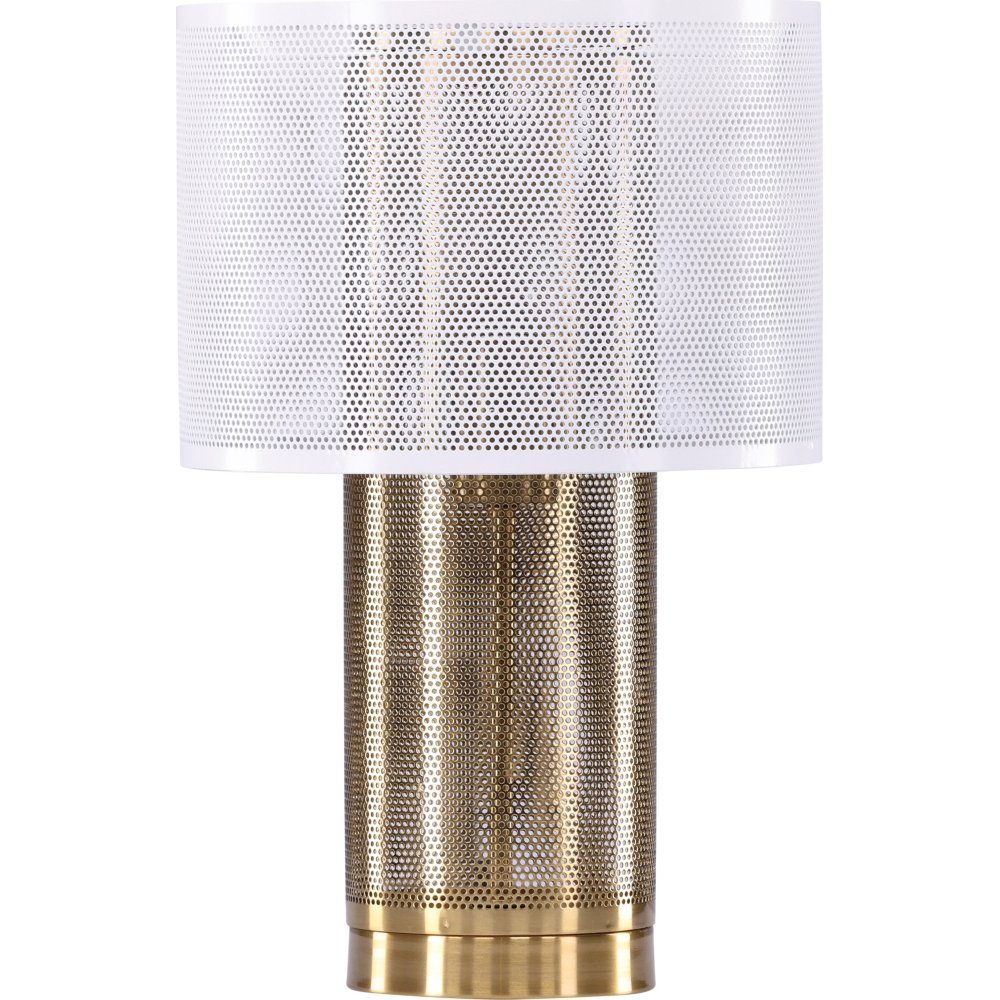 Unik bordslampa för det moderna hemmet. Lampan imponerar med sin guldiga fot och vita lampskärm designad i ett fint meshmönster. Placera lampan på byrån tillsammans med annan dekoration eller ensam som stilikon i ett mörkt hörn för att höja inredningsnivån. Den här lampan blir både en praktisk lampa med ett behagligt ljus och en viktig del av inredningen.